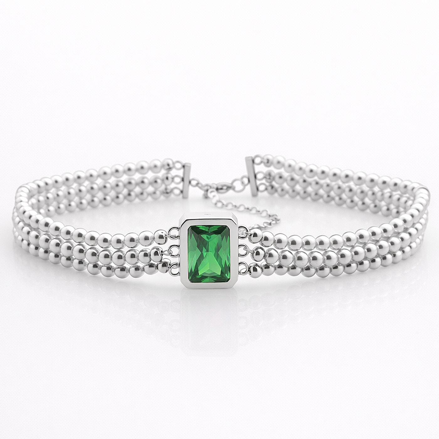 Три ряда гладких сфер из гематита формируют ритм и плотно обрамляют линию шеи, создавая ощущение собранности и структуры. Центральный элемент — прямоугольный зеленый циркон, который задаёт глубину и становится визуальной точкой притяжения.