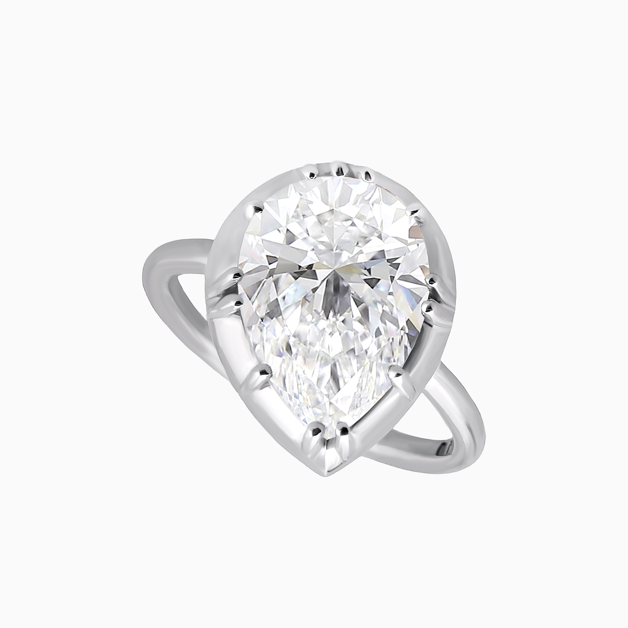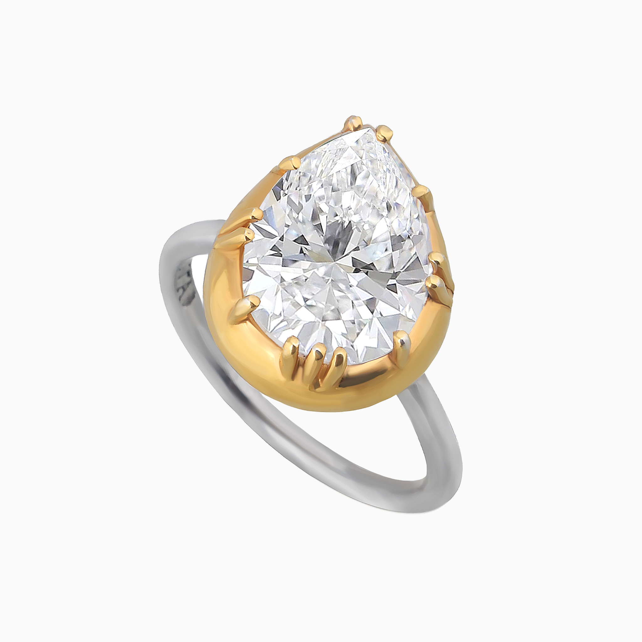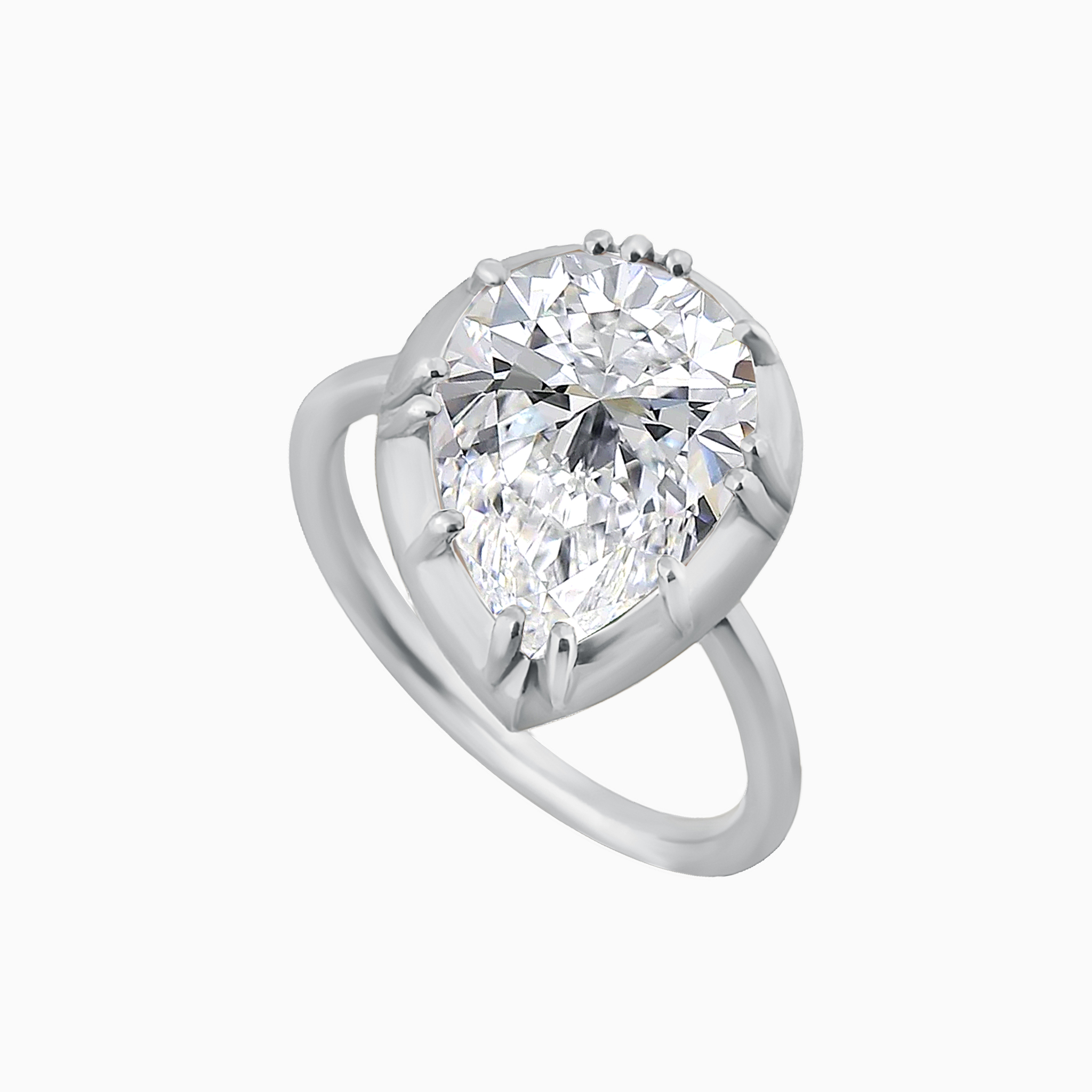 Центральный камень в форме “груши”, сверкающий чистыми гранями, закреплён слегка по диагонали, что придаёт кольцу утончённую динамику и живость. Такой смелый поворот делает традиционную форму более выразительной и современной.
