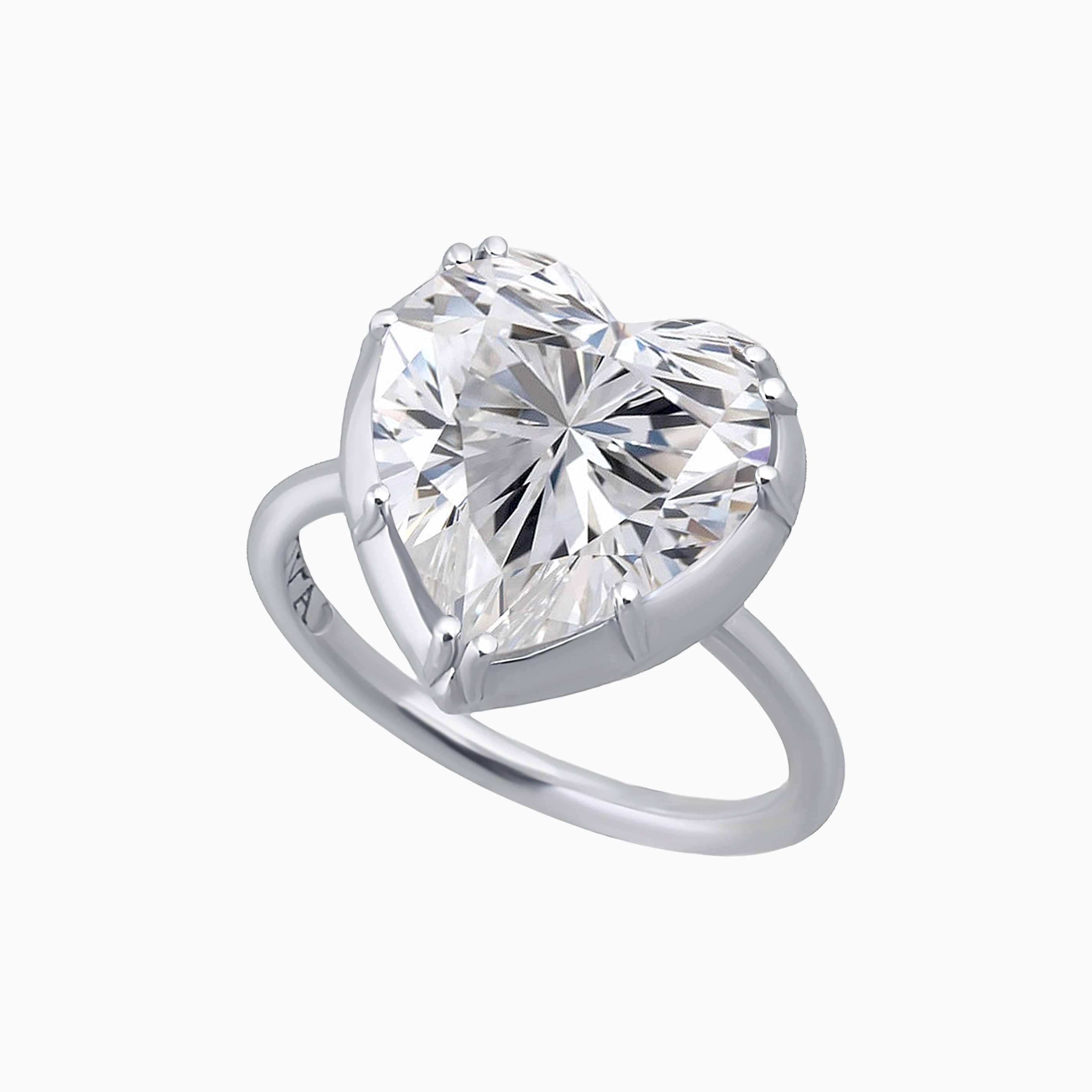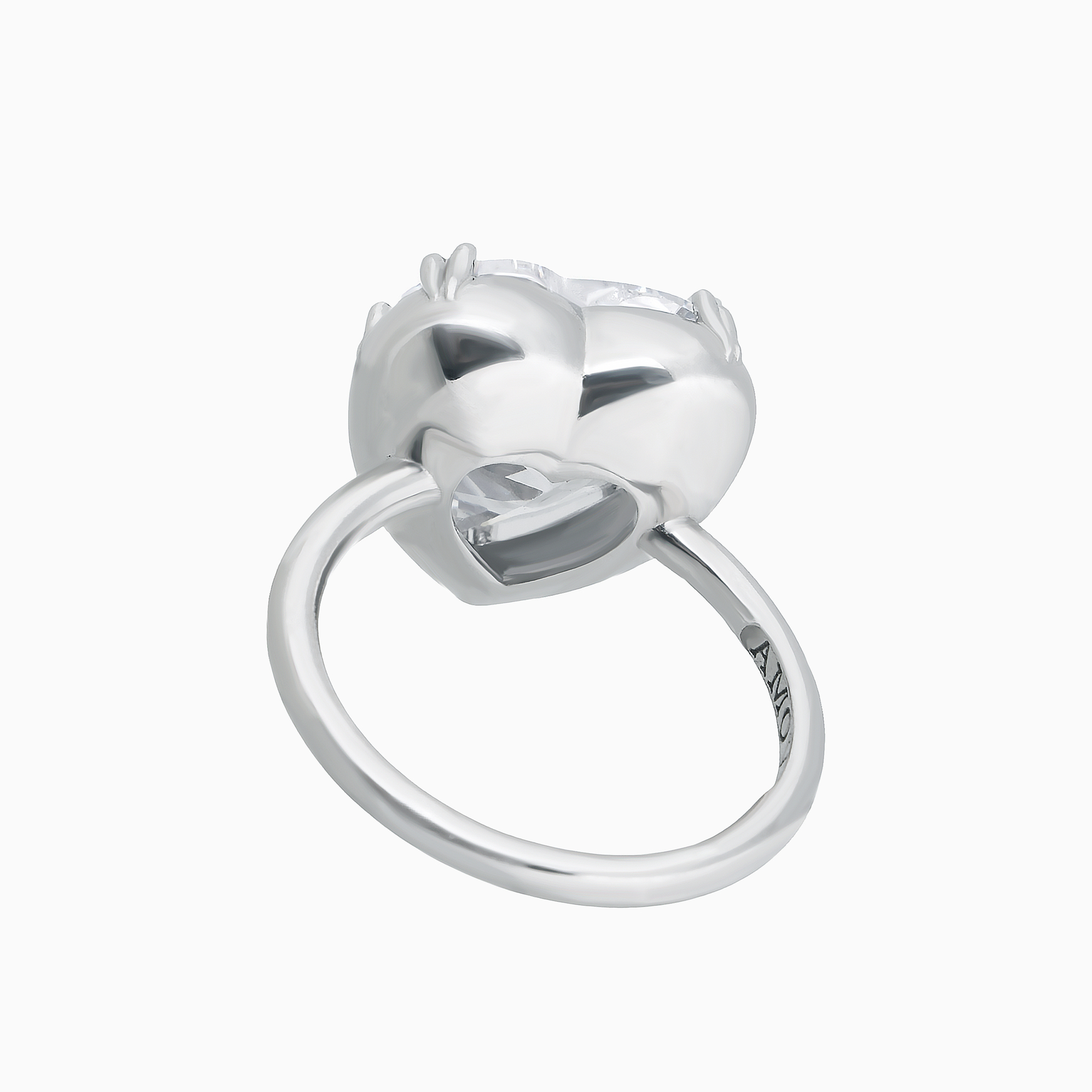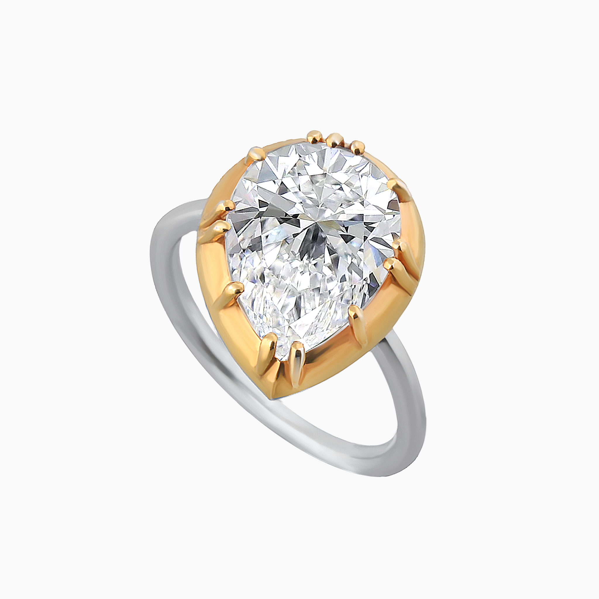 Центральный камень в форме “груши”, сверкающий чистыми гранями, закреплён слегка по диагонали, что придаёт кольцу утончённую динамику и живость. Такой смелый поворот делает традиционную форму более выразительной и современной.