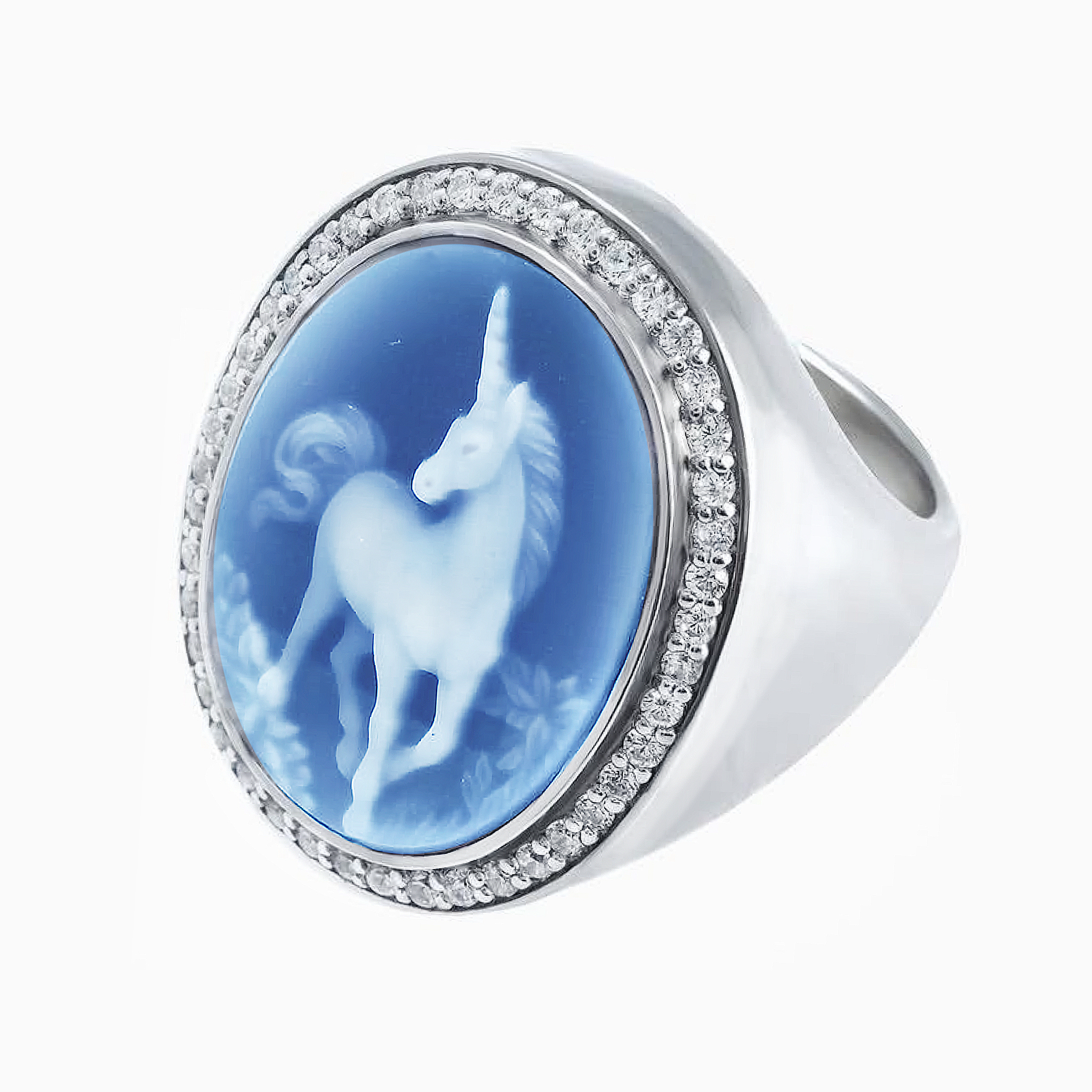 Центральное место занимает искусно выполненная камея из натурального голубого агата, на которой изображён изящный единорог — древний символ чистоты, мудрости и внутренней силы. Издревле считалось, что единорог притягивает счастье, защищает своего обладателя от невзгод и вдохновляет на исполнение заветных желаний.
